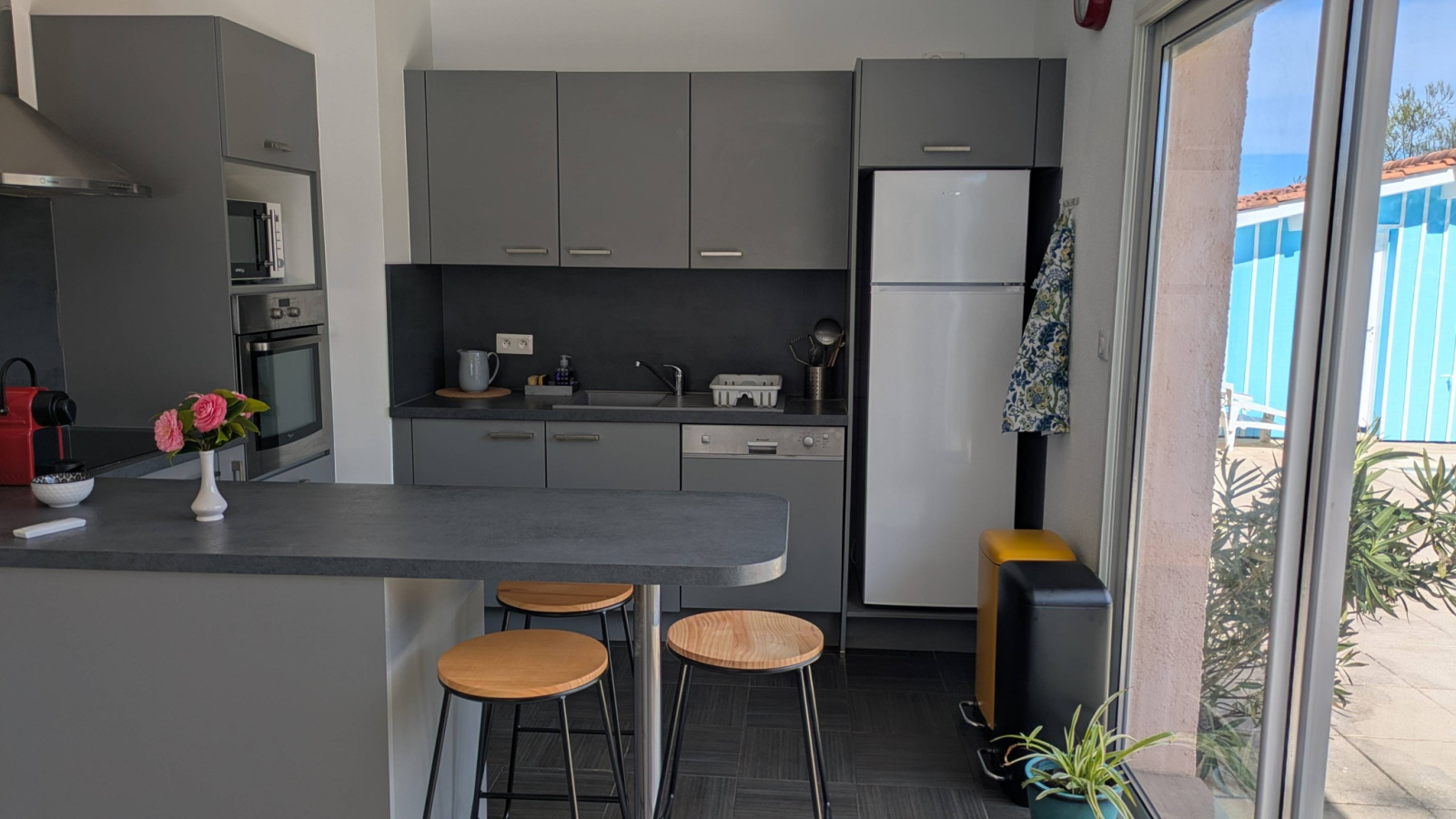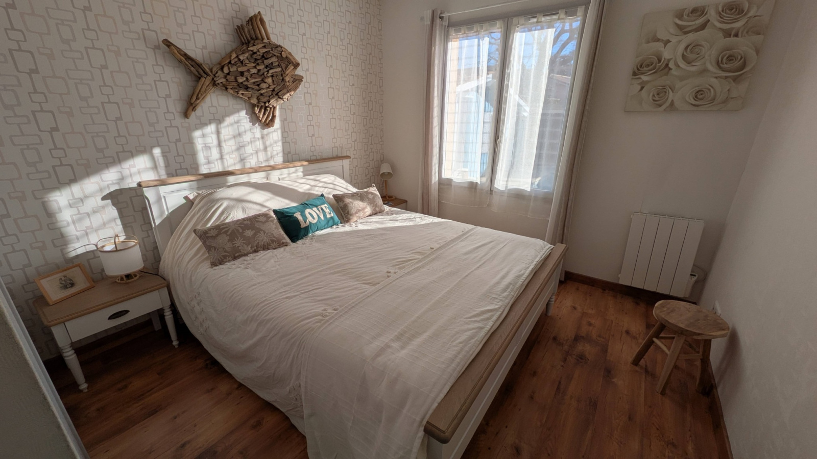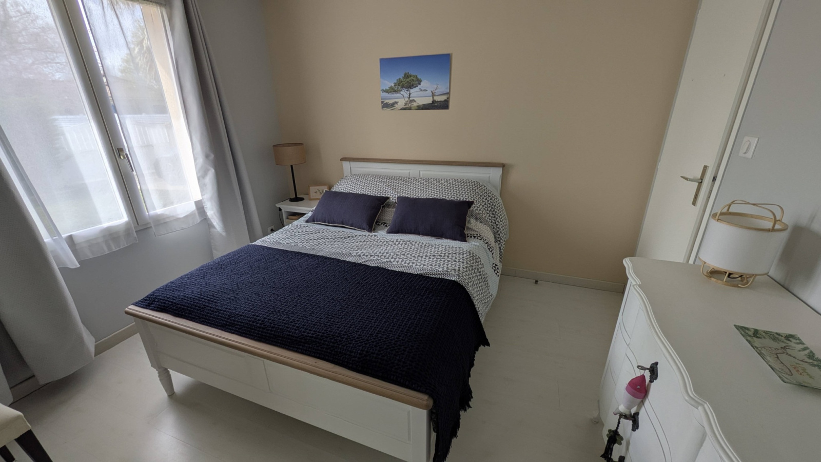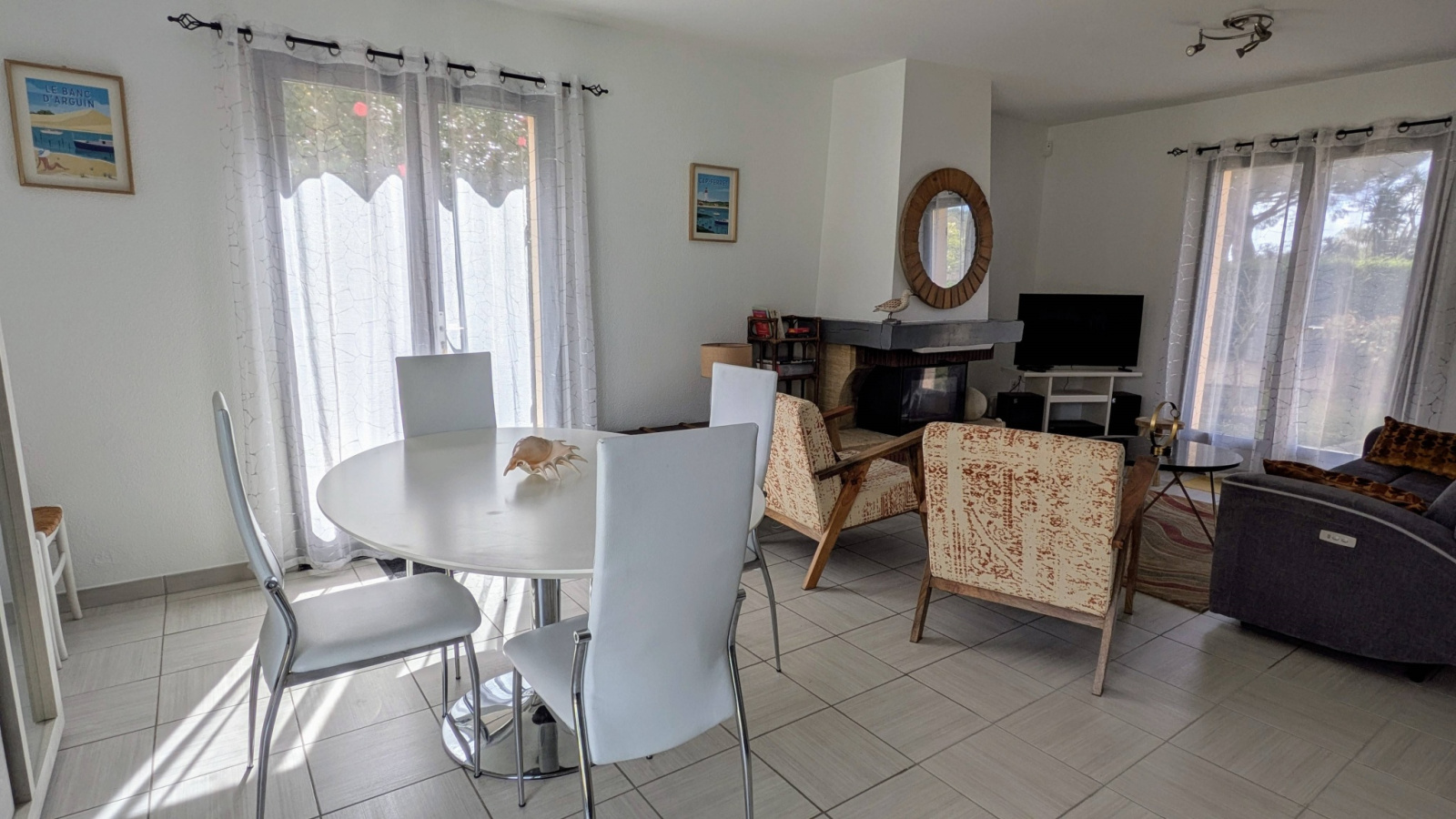 Cette maison comprend un grand séjour avec cuisine ouverte, 3 chambres dont une avec un lit double 160, une deuxieme avec lit 140 et une troisième avec deux lits simples de 80 .