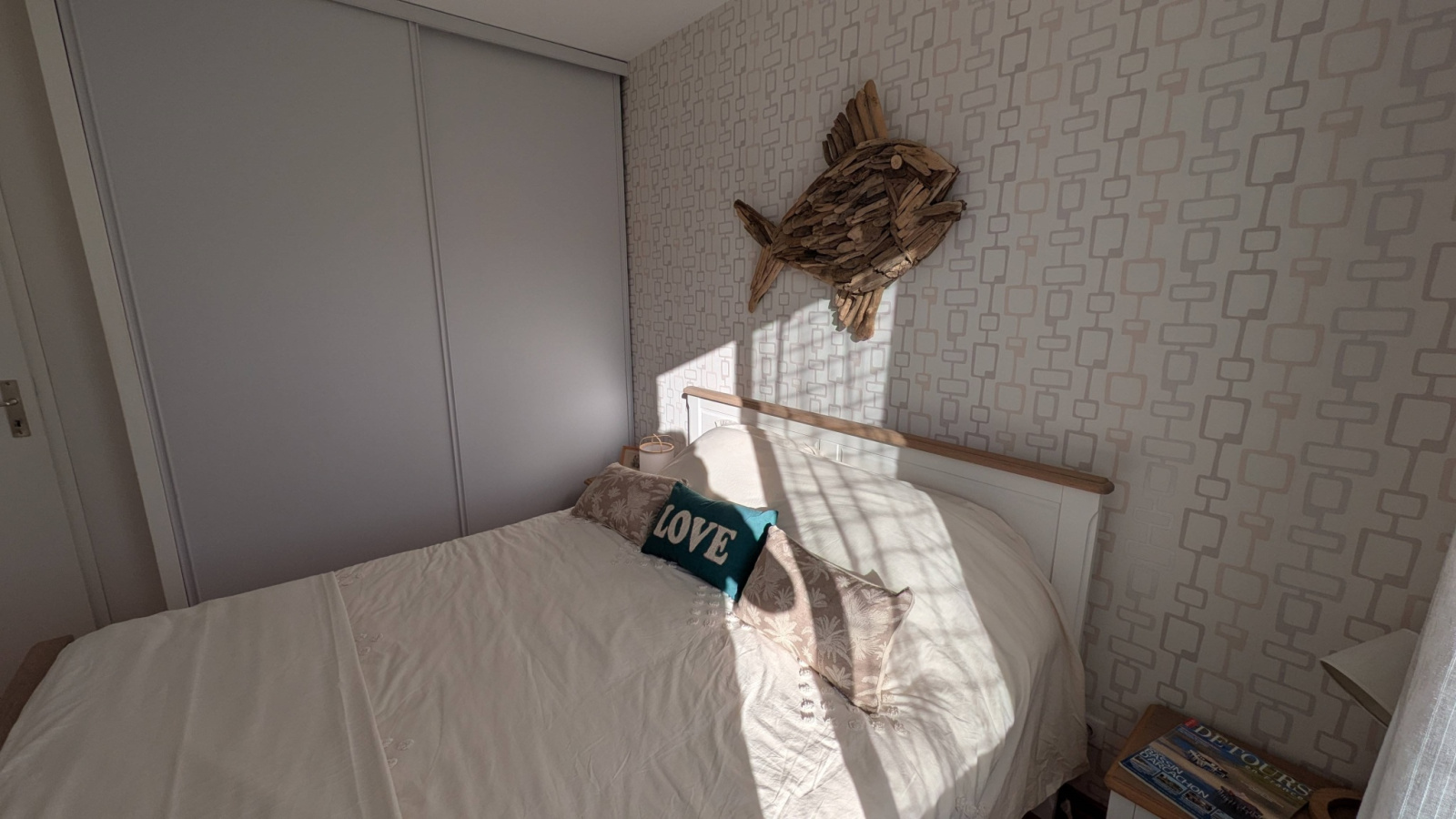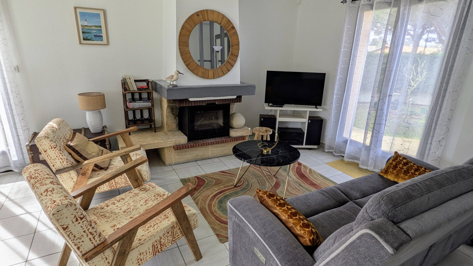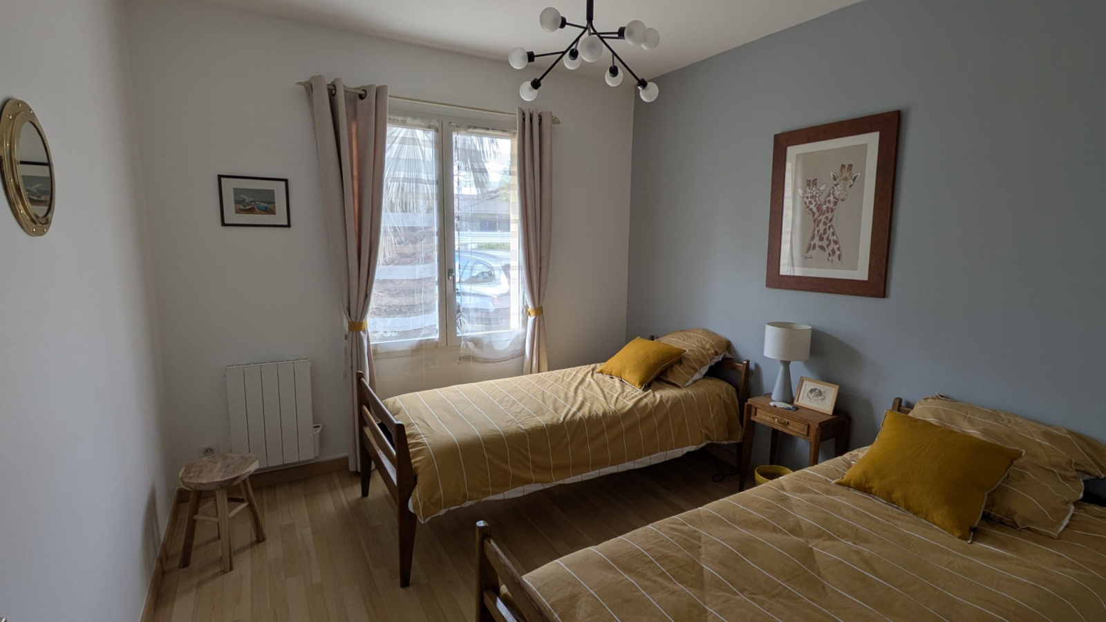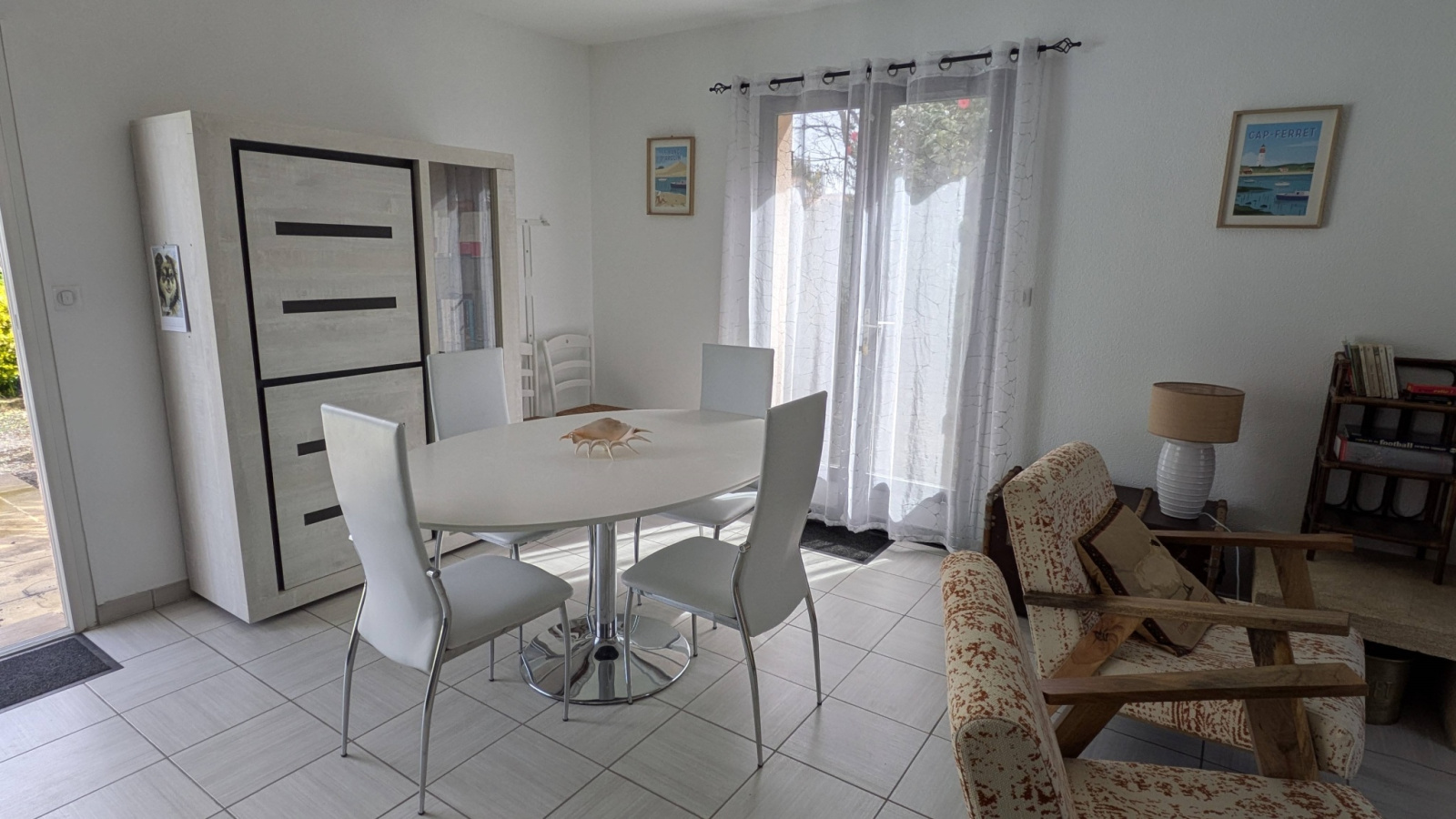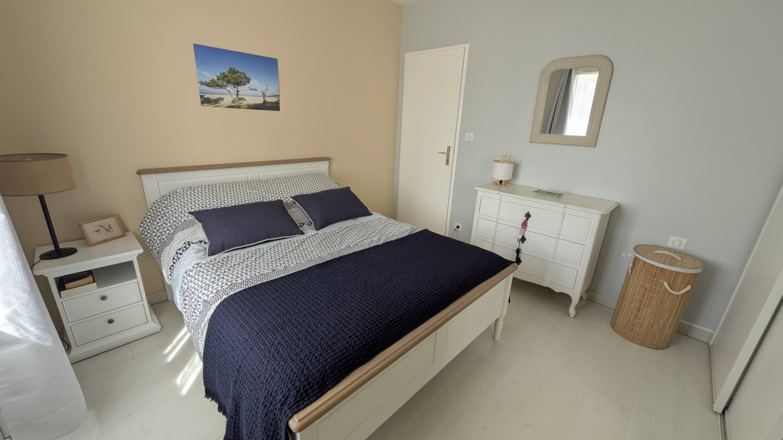 Cette maison comprend un grand séjour avec cuisine ouverte, 3 chambres dont une avec un lit double 160, une deuxieme avec lit 140 et une troisième avec deux lits simples de 80 .