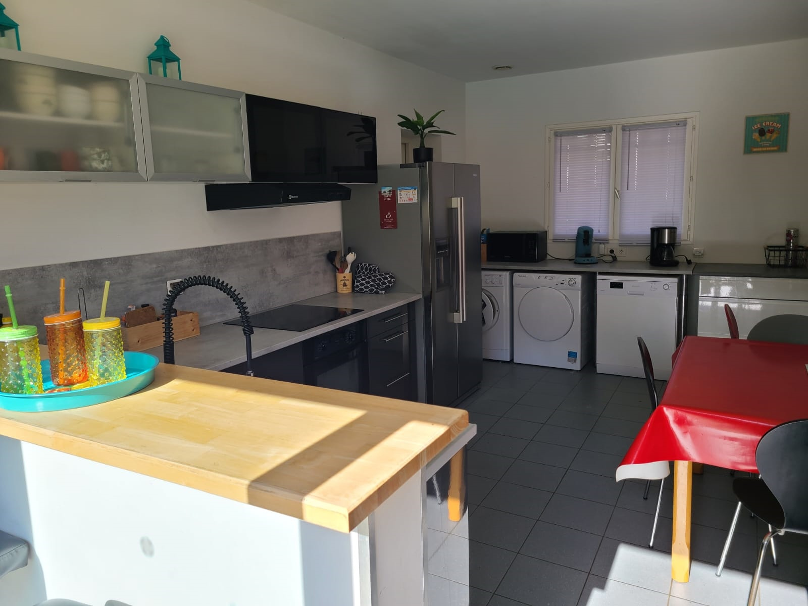 Grande pièce à vivre de 70m2 avec un billard, la cuisine est séparée et entièrement équipée.